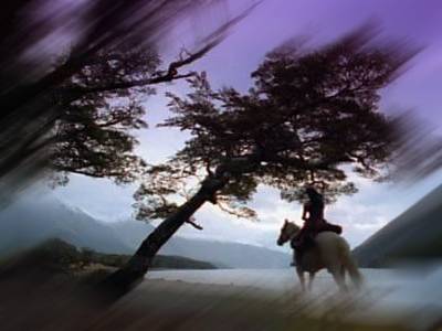 She paused at the crest of a majestic hill, a proud silhouette against the sun, hands unconsciously gentling the restless Palomino beneath her, eyes reflecting the hue of the sky, the blue expanding in her study of white wisps floating overhead. Had it always been thus? So serene, so comforting? She scanned the rolling emerald landscape, the sparkling silver that pooled and coursed in valleys below. This breathtaking? Yes, she nodded, remembering. She had even felt part of it once. Before the day sheíd vowed to make it all hers. |