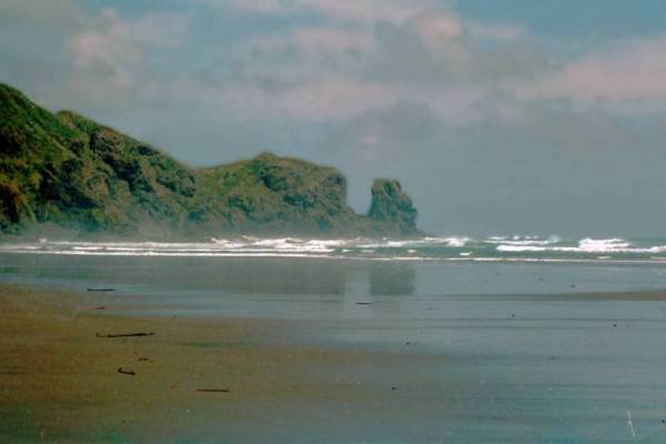 BETHELL'S BEACH Pukekowhai Point reflected in the wet sand Photographer: Warren Serkin
